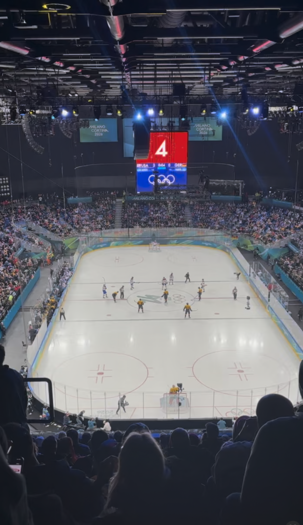 The most prominent part of my trip to Milan wasn’t just the game itself, but the people around me. I met fans from Germany, Canada, Italy, and even other American study abroad students, all of us were so incredibly excited to be at the Olympics. Despite supporting different teams, there was a mutual respect and shared joy that made the experience feel bigger than just a competition. But, it didn’t hurt that the USA nearly shut out Germany, finishing with a 5-1 score.