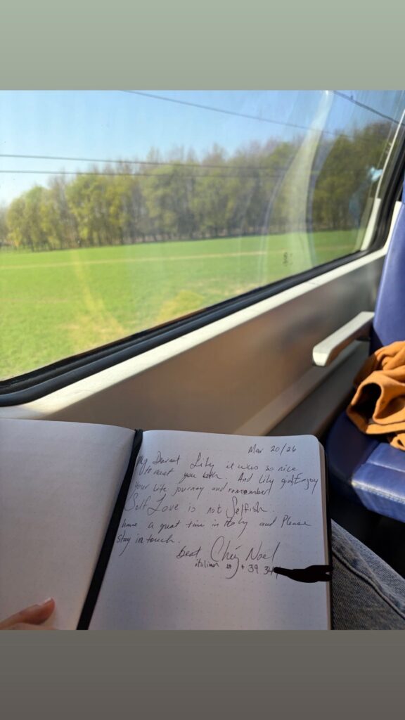She shared stories of her life, including her childhood in Canada, her relationships, and, most notably, her extensive travels around the world. As she recalled the events of her travels, each story had a central theme. She explained that with every journey, she left behind a part of herself and gained something new in return—what she referred to as her “souvenirs.” For her, these experiences were more valuable than any material possession, as they fostered openness, personal growth, and new perspectives.